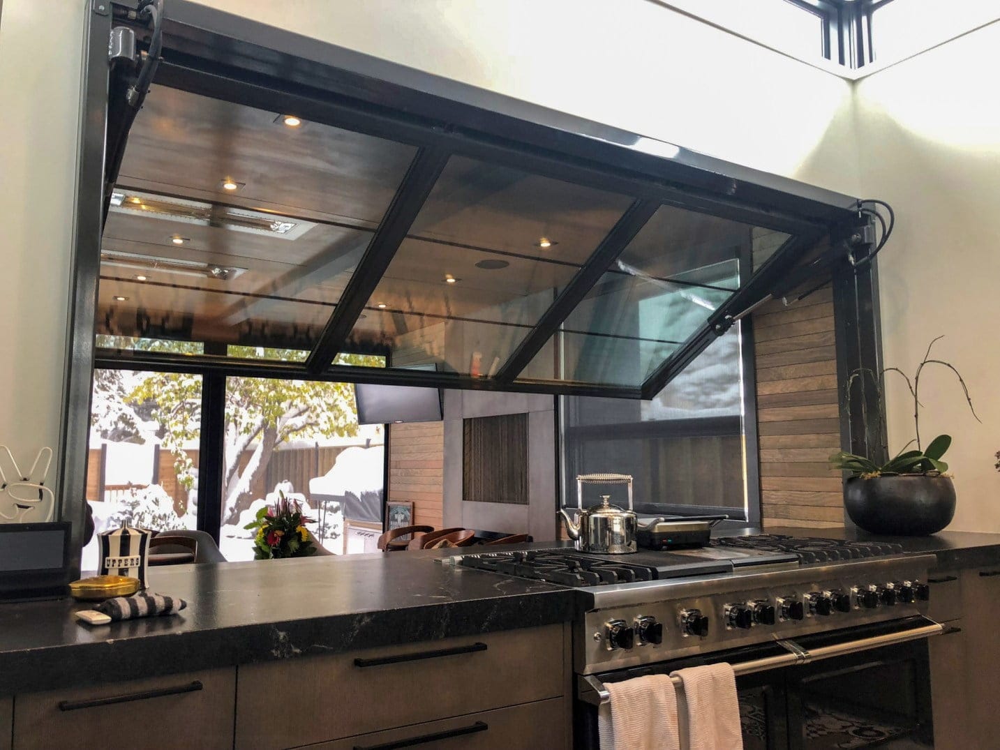Glass walls offer a practical and stylish addition to your kitchen, great room, or any area within your home. This family desired year-round accessibility to their insulated patio, and the PowerLift glass wall facilitates seamless service from the kitchen to the patio, eliminating any delays when serving food to guests.