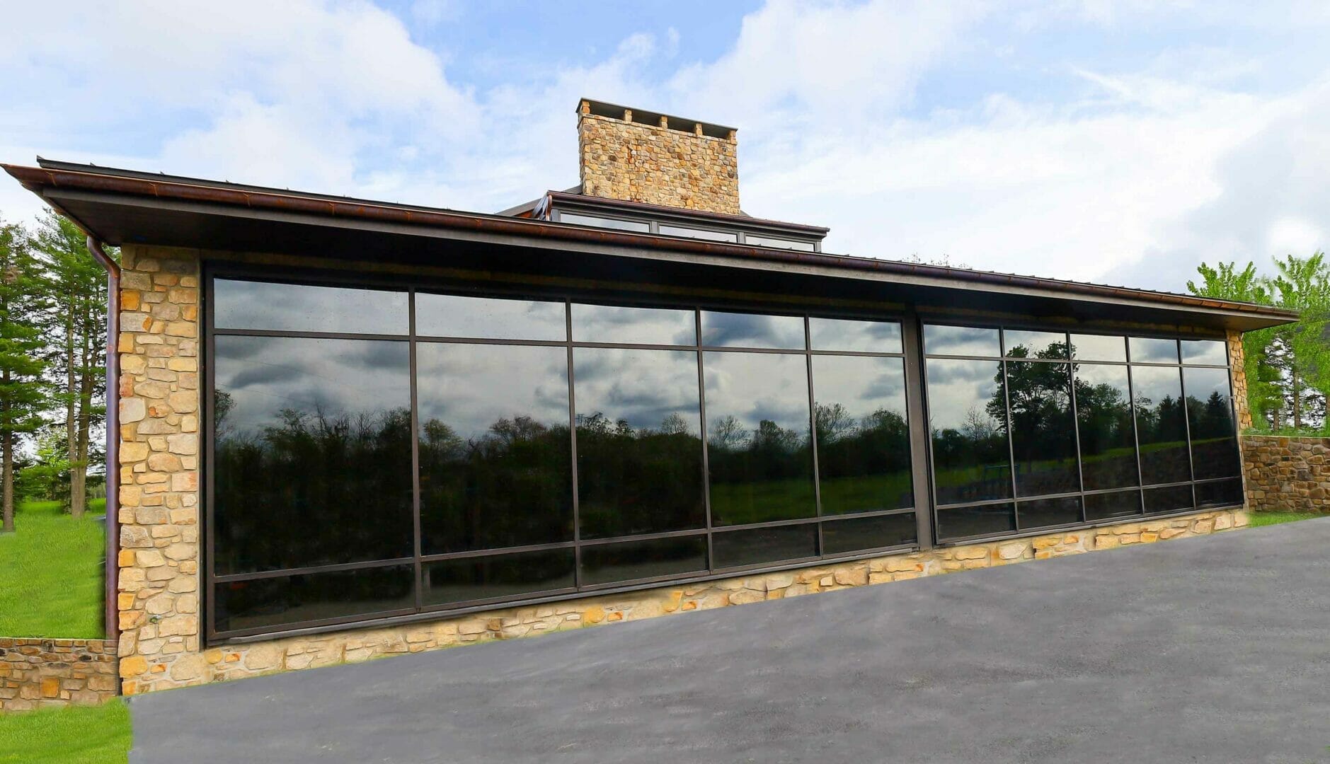 Concealed Cylinder builds the perfect central design element for any building project. These two Concealed Cylinder walls are clad with reflective glass. One opening wall accesses a helicopter hangar, the other a muscle car garage. Inside are found concert rooms, a fireplace on each level, brick ovens, and other amenities too numerous to list. Concealed Cylinder walls are an ideal choice for homes, vacation cabins, man/woman caves, and business premises. Get in touch with us when planning new construction or a remodel, and we’ll help you create something memorable. Our customers love combining indoor and outdoor venues into a single space through their Concealed Cylinder glass walls.